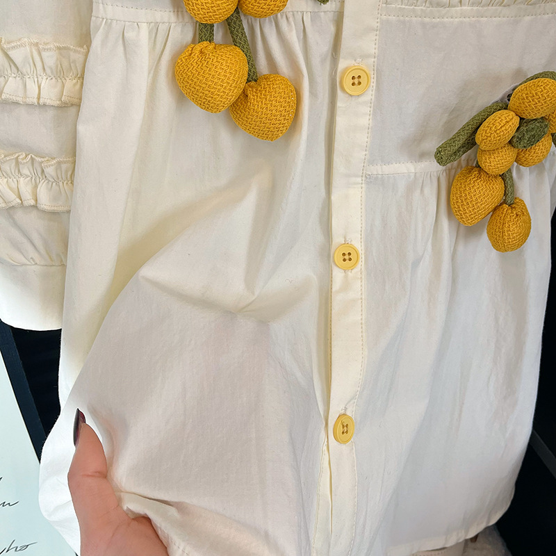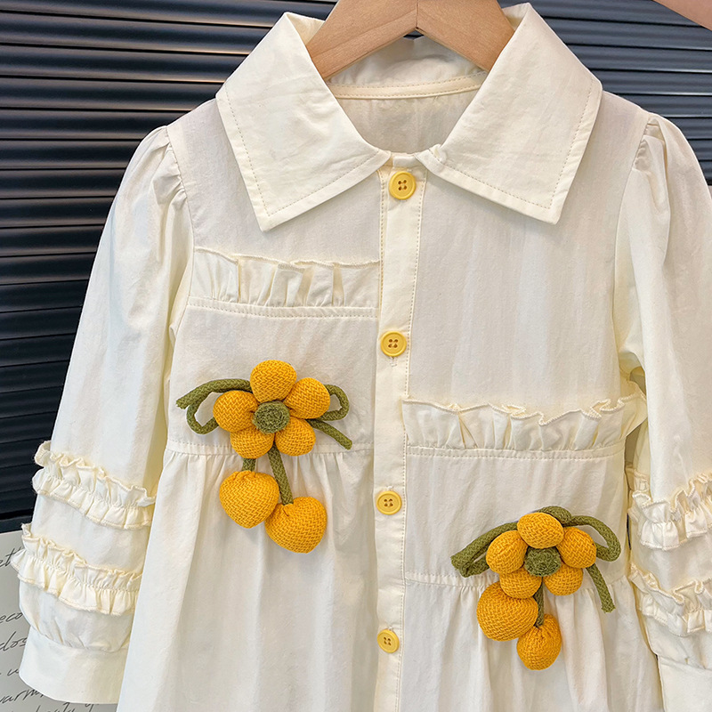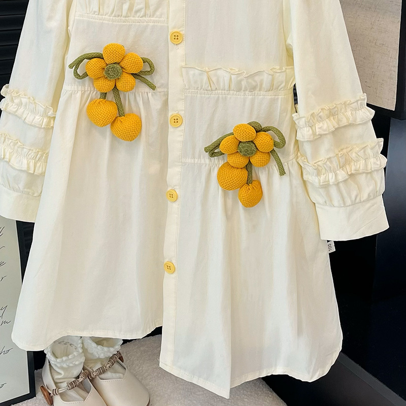 Baby Girl Long Sleeve Dress – French Style Cotton Shirt Dress with 3D Floral Decoration