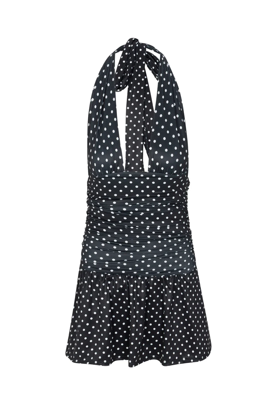 Black Polka Dot Halter Neck Dress|Ruched Waist A-Line Mini Dress|Vintage Summer Party Dress