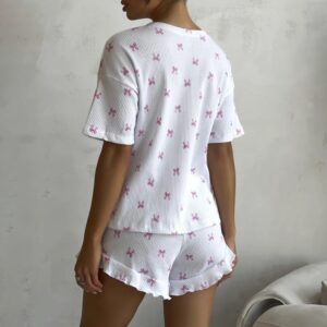 The top comes in a relaxed short-sleeve fit with a classic round neckline, offering comfort without restriction. The matching high-waist shorts feature an elastic waistband with an adjustable drawstring for a secure and flexible fit. Subtle ruffle hems add a playful and stylish finish.