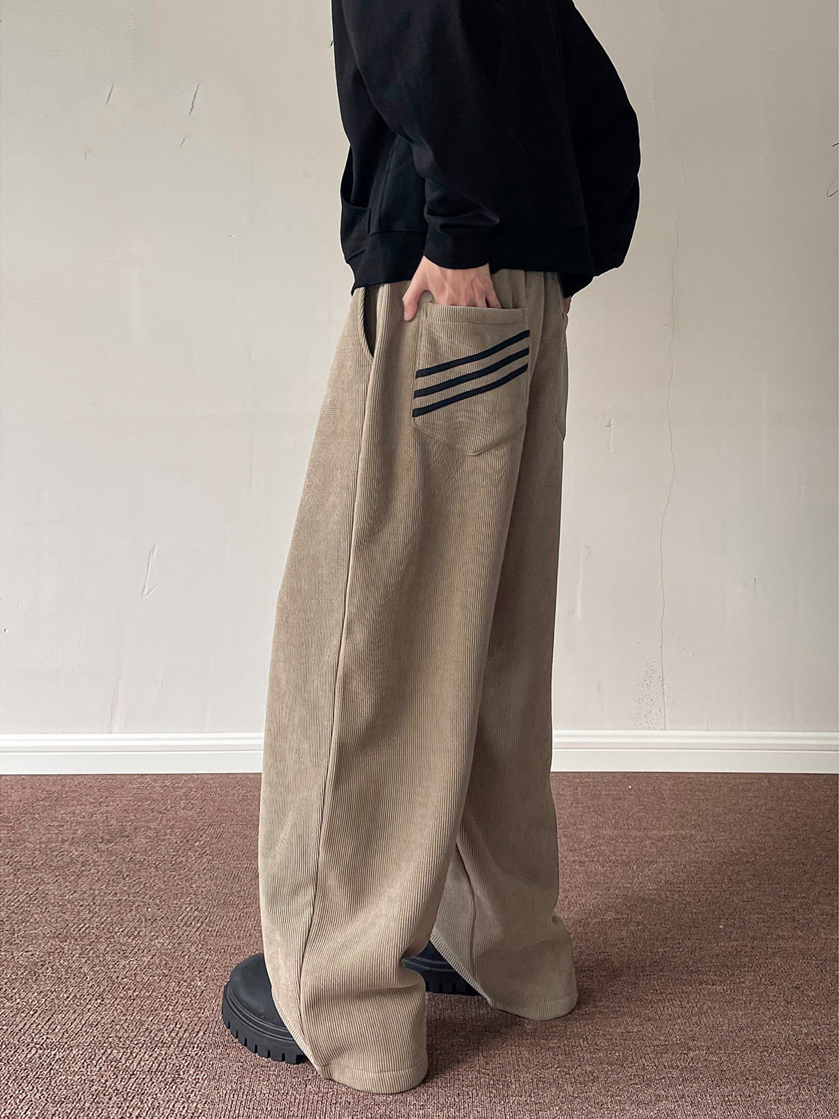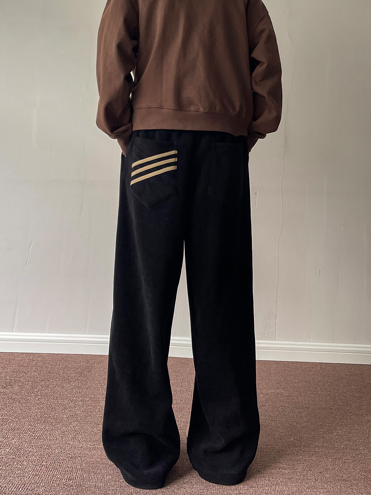 Subtle striped detailing on the back pocket adds a minimalist design touch, elevating the overall look without being overpowering.