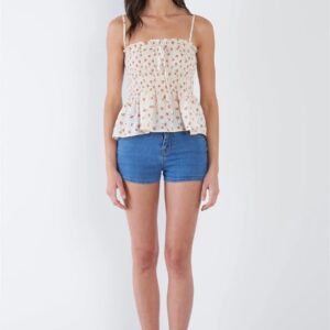 Top Features: square neckline, front tie bow, smocked bodice, frill trim, peplum crop top, adjustable cami straps, sheer, red beige and green floral print, boho, vintage, casual, unlined, super stretchy.Model is 5’9 wearing a size Small ( Waist: 23.5″, Bust: 32B, Hips: 36″)Item Measurements: Length: 20.5″ , Bust: 27″Item comes pre-packed with hang tagsTrue to size