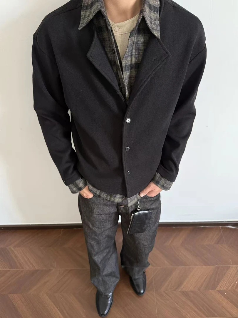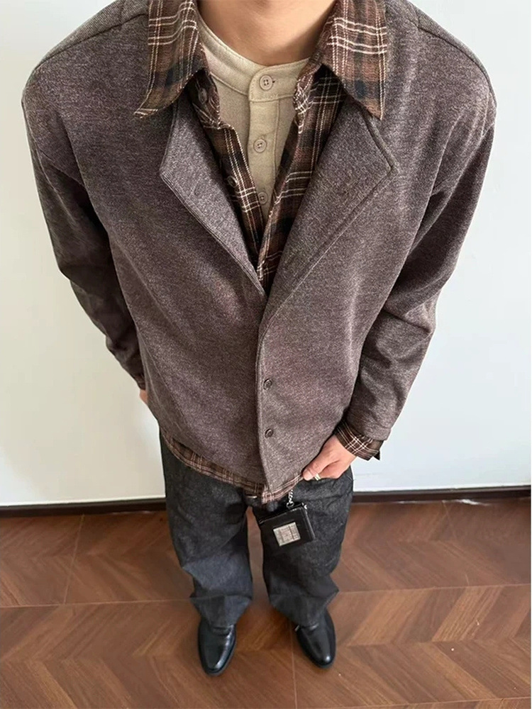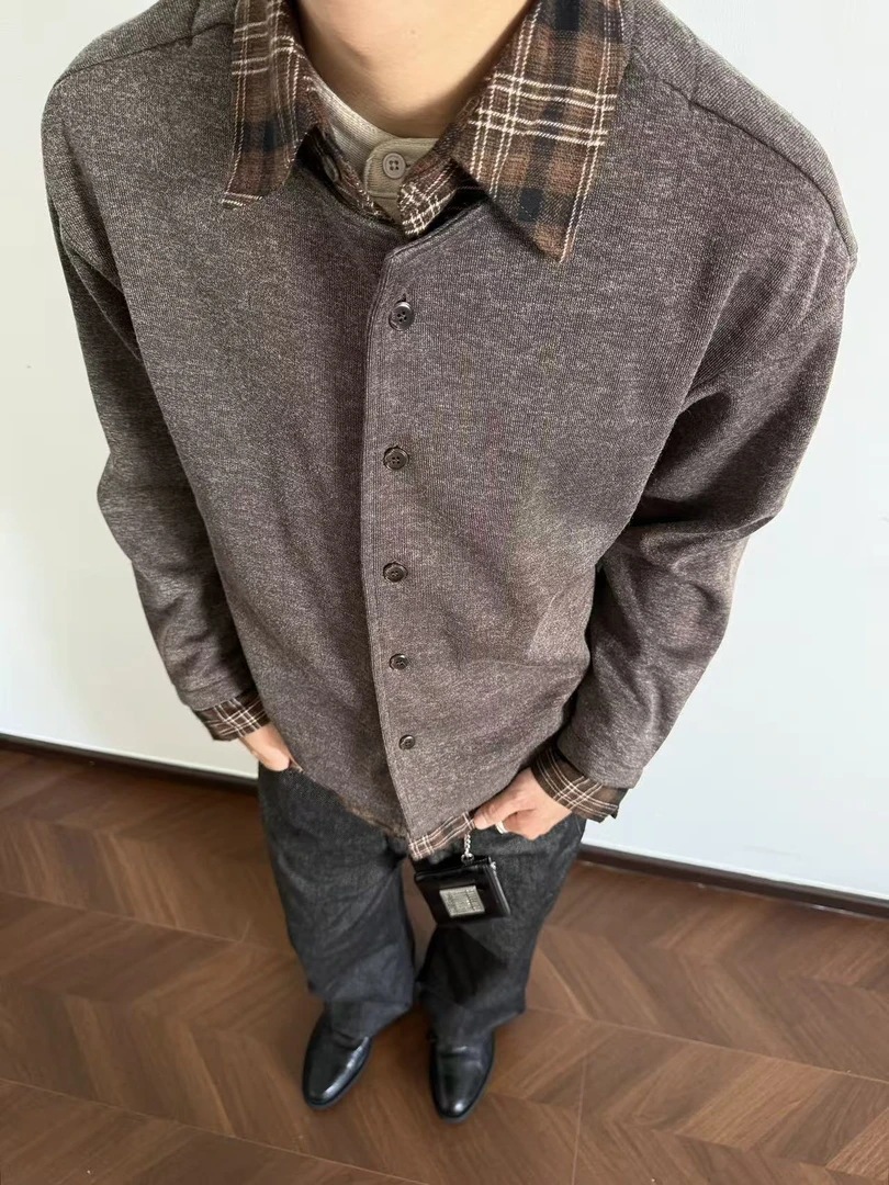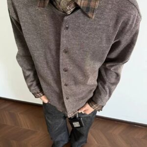 Designed with a relaxed, straight fit, it flatters various body types while offering comfort and ease of movement. The exposed plaid details at the collar, cuffs, and hem add a classic vintage and academic vibe, making it perfect for casual wear, daily commuting, or street-style outfits.