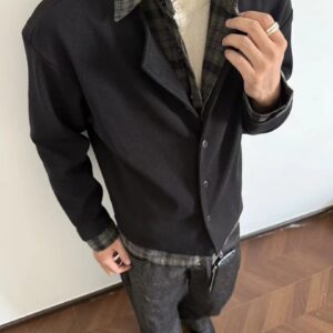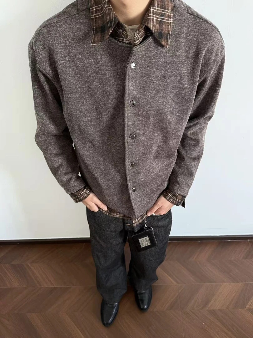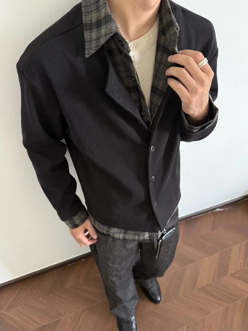 This men’s faux two-piece shirt jacket features an integrated layered design that combines a solid-color outer shirt with a plaid inner layer, creating a stylish layered look without the need for extra pieces.
