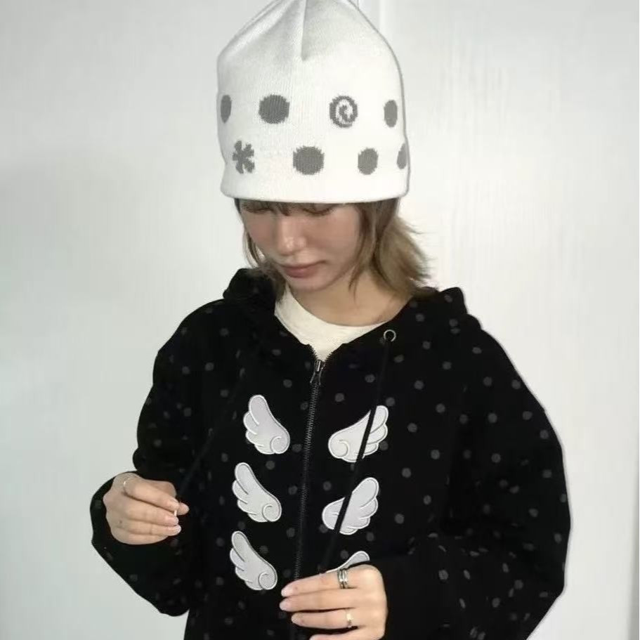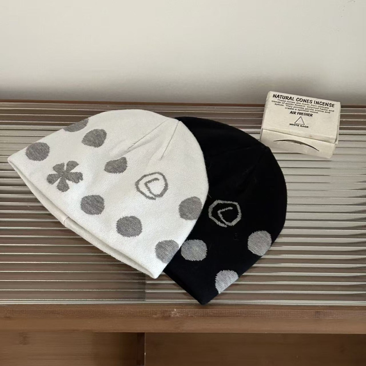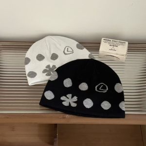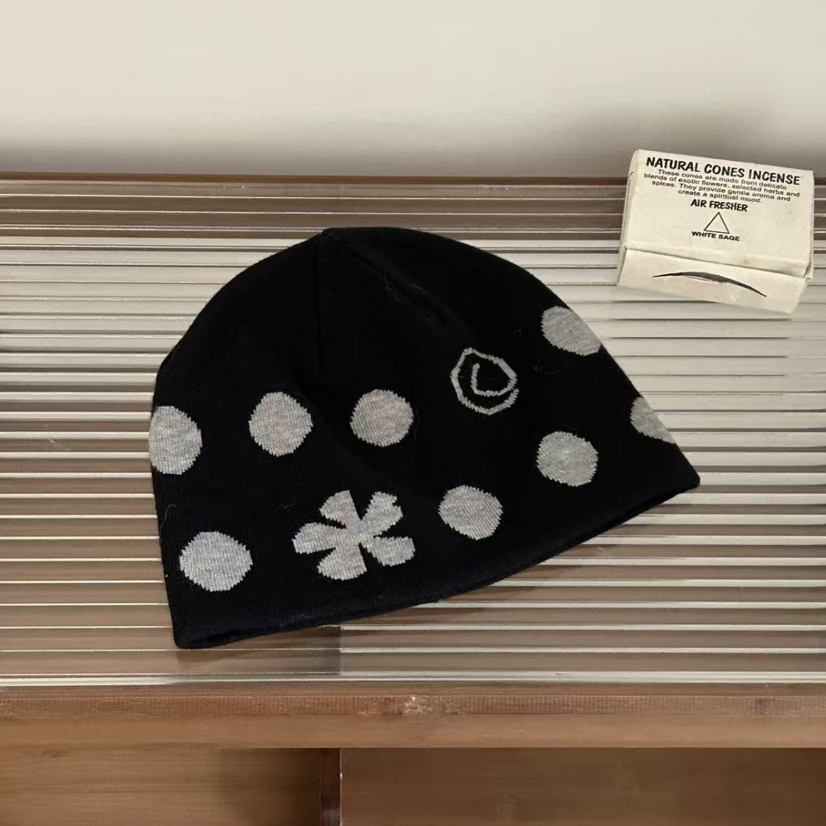 This knit beanie is made from soft, stretchy fabric that provides a comfortable and snug fit without pressure. Featuring a stylish combination of polka dots and geometric patterns, complemented by a minimal logo detail, it adds visual interest while maintaining a clean, modern look.