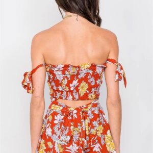 Floral Off-Shoulder Tie Crop Top & Skirt Set with Ruched Bodice and Frill Hem