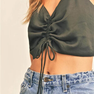 🖤 Features: Luxurious satin-finish fabric, adjustable spaghetti straps, deep V-neckline, ruched front detail, adjustable drawstring ties, cropped silhouette, feminine cami design, versatile styling, contemporary appeal, true to size fit