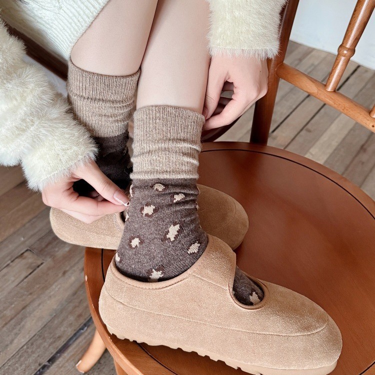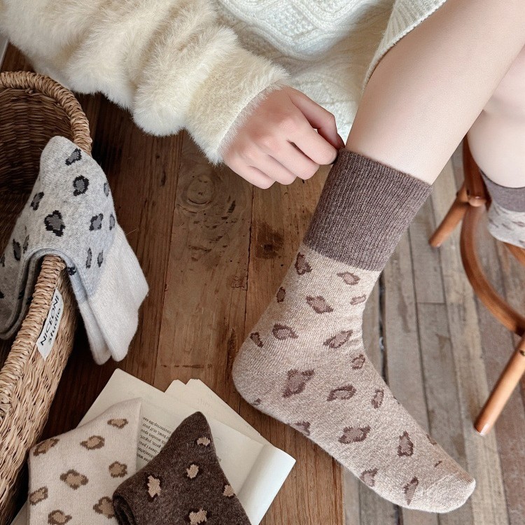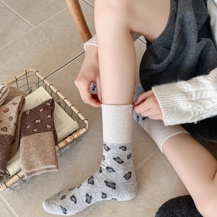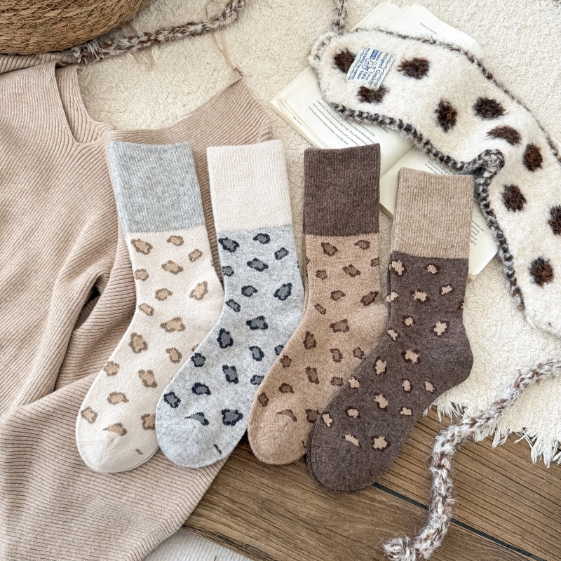 This crew socks set features a soft leopard print design inspired by vintage French and Japanese aesthetics. The leopard pattern is subtly refined, creating a gentle and elegant look that is easy to wear for everyday outfits.