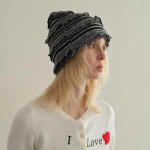 This knit hat features a finely textured construction with layered knitting patterns and subtle raw-edge detailing, creating a relaxed yet thoughtfully designed silhouette. The shape blends elements of a bucket hat and a beanie, sitting naturally on the head to flatter different face shapes while offering a vintage-inspired aesthetic.