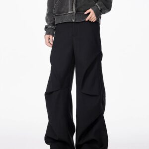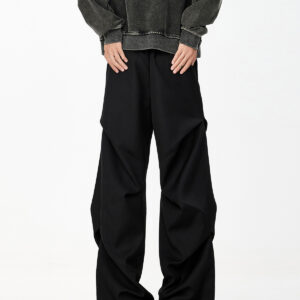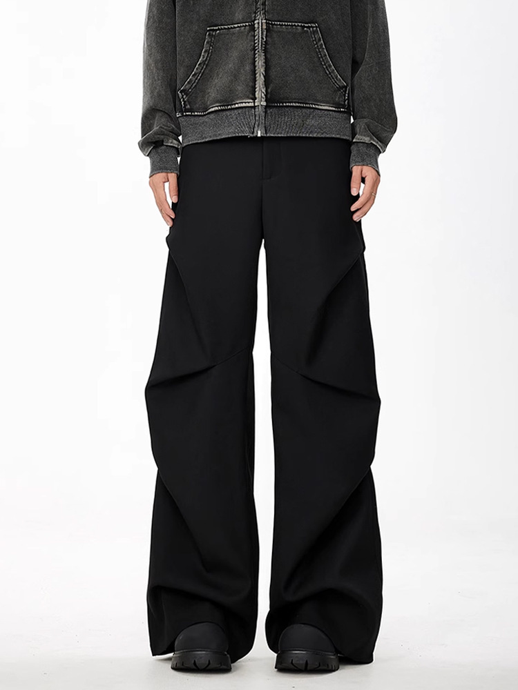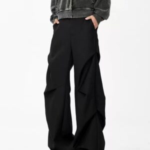 These unisex wide-leg pants are designed with a sculpted, avant-garde silhouette, featuring asymmetrical panel construction that adds depth and movement to the overall look. The structured design breaks away from traditional straight-leg styles, creating a bold yet wearable statement.