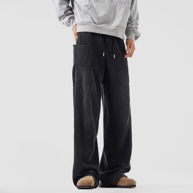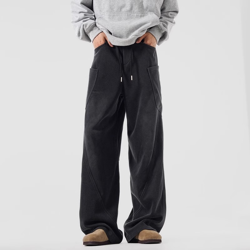 These unisex casual pants feature a sculpted construction with panel detailing, designed to create a clean yet dimensional silhouette. The structured seams add visual depth while maintaining a relaxed and comfortable fit.