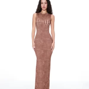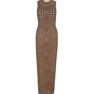 Vintage Brown Checkered Sleeveless Dress | Slim Fit Long Bodycon Dress
