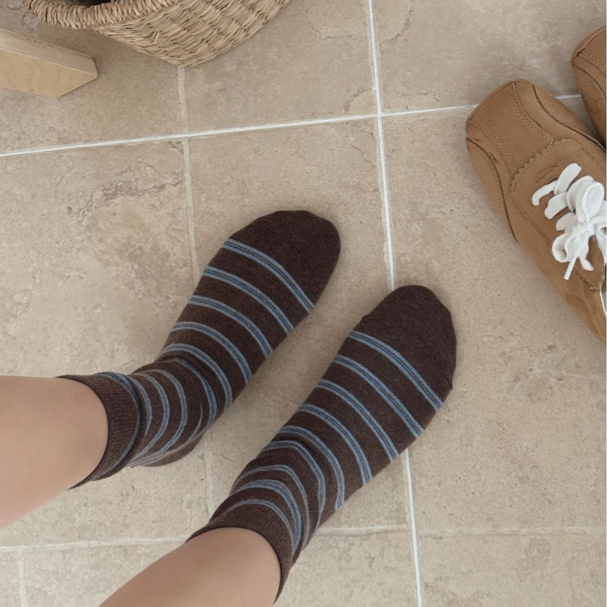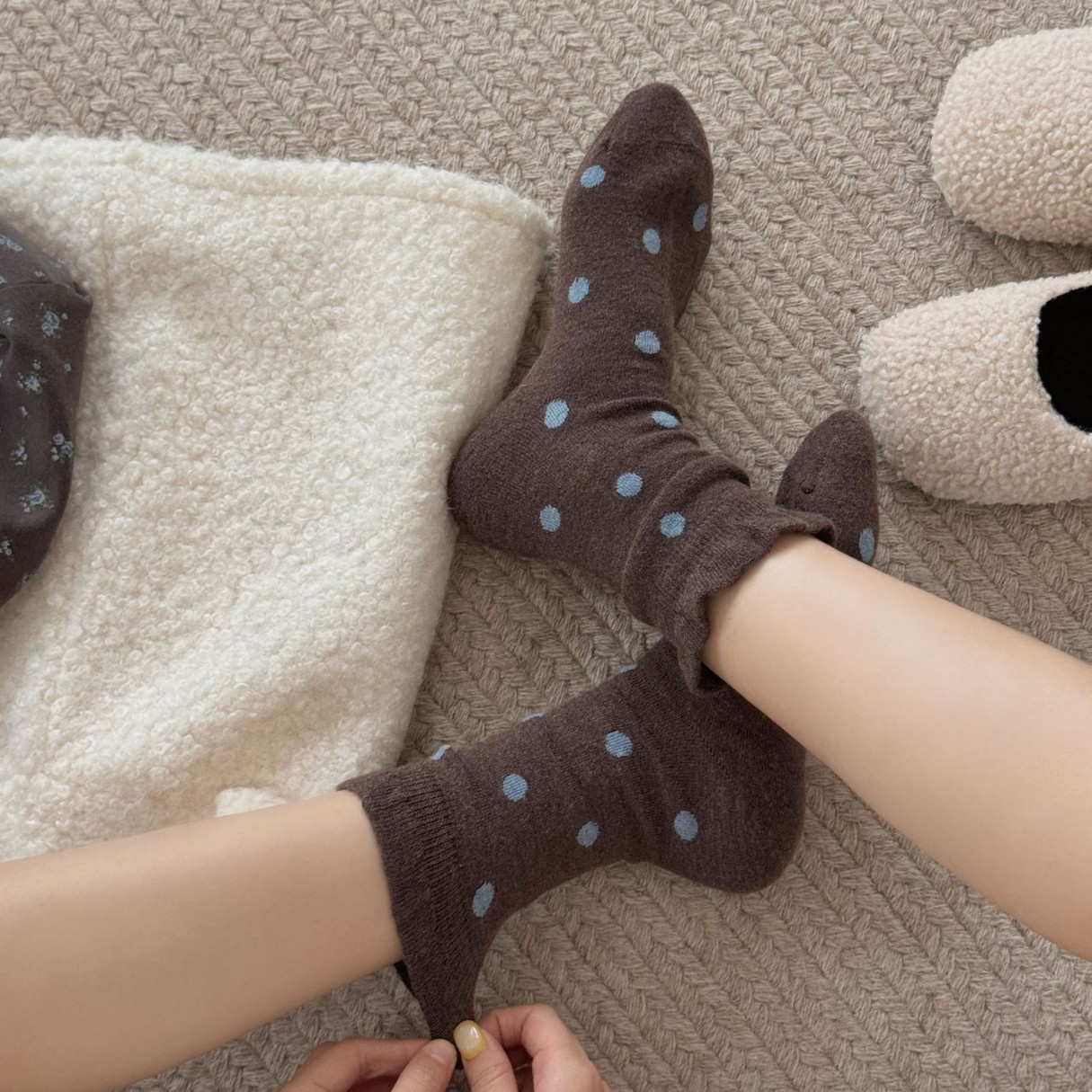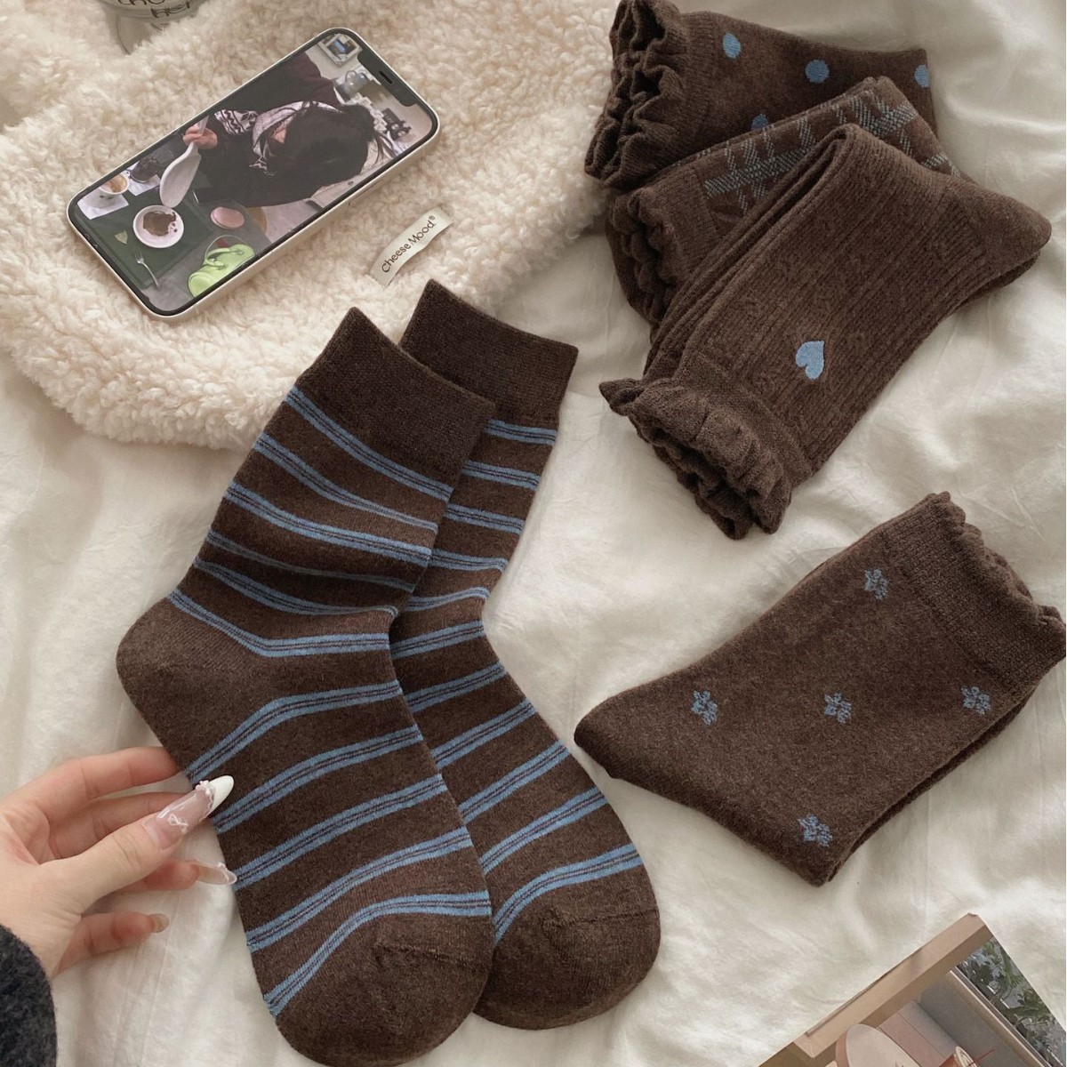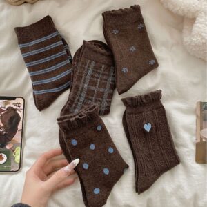 This 5-pair crew sock set features a warm vintage brown color palette accented with muted blue details, creating a calm and timeless autumn-winter aesthetic. Each pair offers a distinct pattern while maintaining a cohesive look, making the set ideal for everyday rotation and effortless styling.