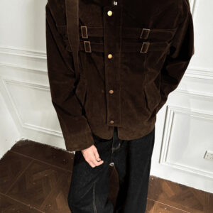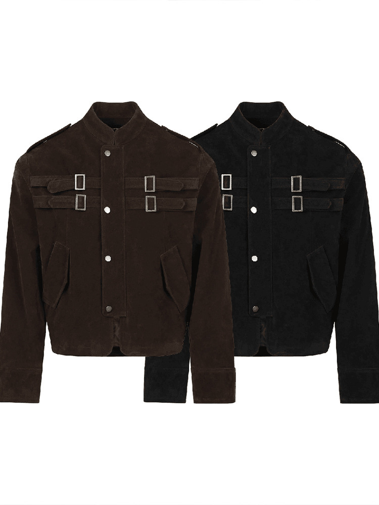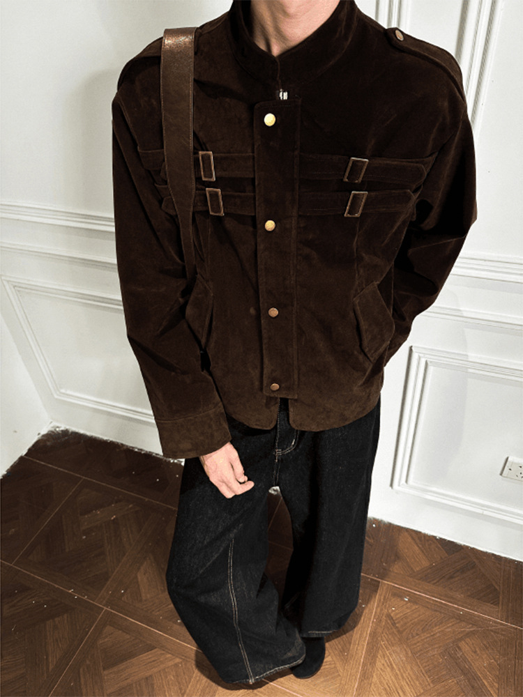 This shirt-style jacket draws inspiration from classic military and workwear designs, featuring a structured silhouette with a strong, masculine aesthetic. The stand collar combined with metal snap-button closure creates a clean yet powerful look, ideal for fall and winter layering.