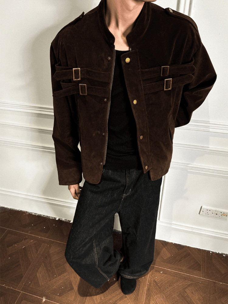 Distinctive double strap buckle details on the chest enhance visual depth while reinforcing the military influence. The cropped length balances proportions and makes it easy to style with high-waisted pants. The fabric offers a firm, structured feel that holds its shape throughout the day.