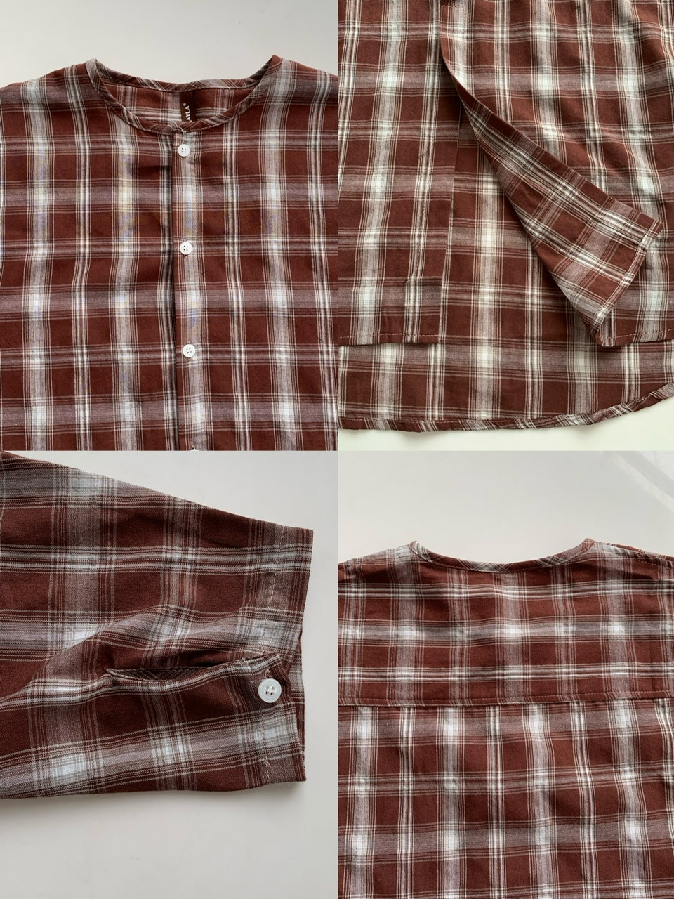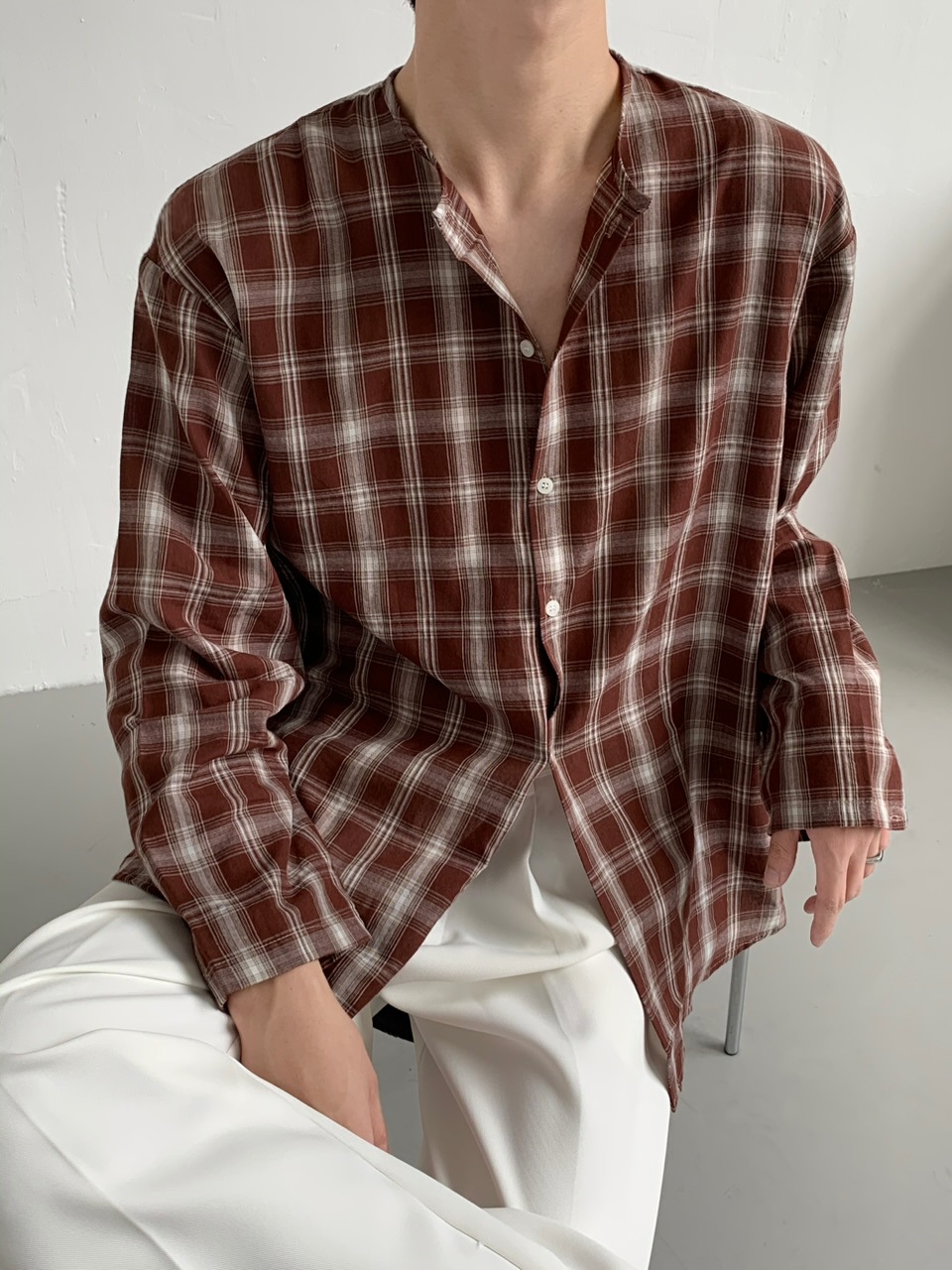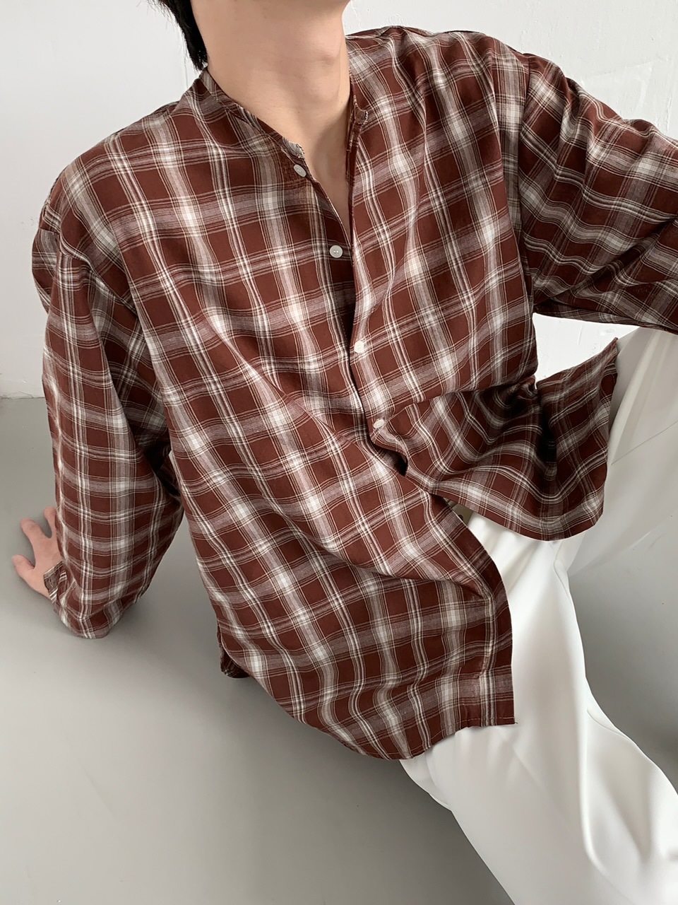 This shirt features a vintage-inspired plaid pattern, offering a timeless and understated look with a subtle artistic touch. Designed with a stand collar and partial button placket, it softens the formal feel of a classic shirt, creating a more relaxed and natural silhouette.