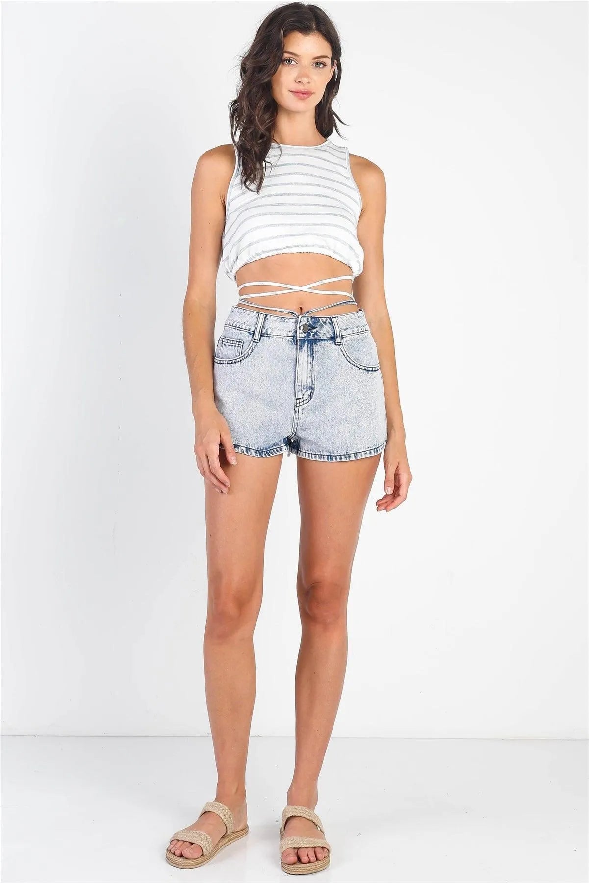 White & Light Blue Striped Self-Tie Sleeveless Crop Top
