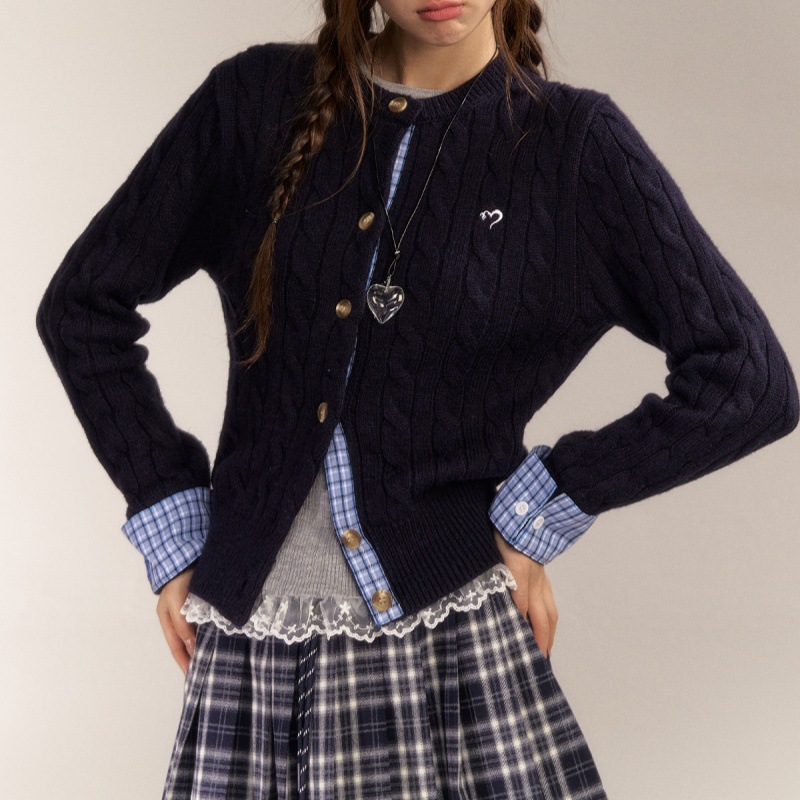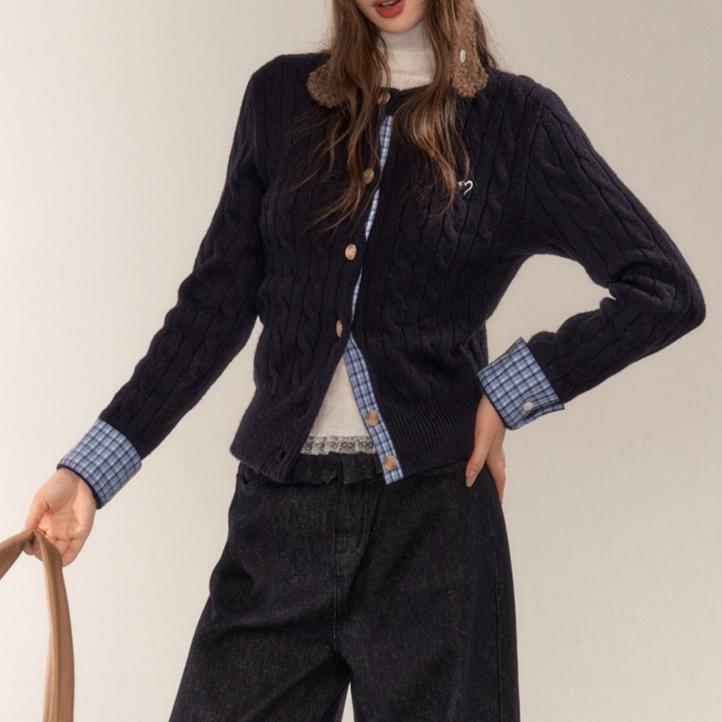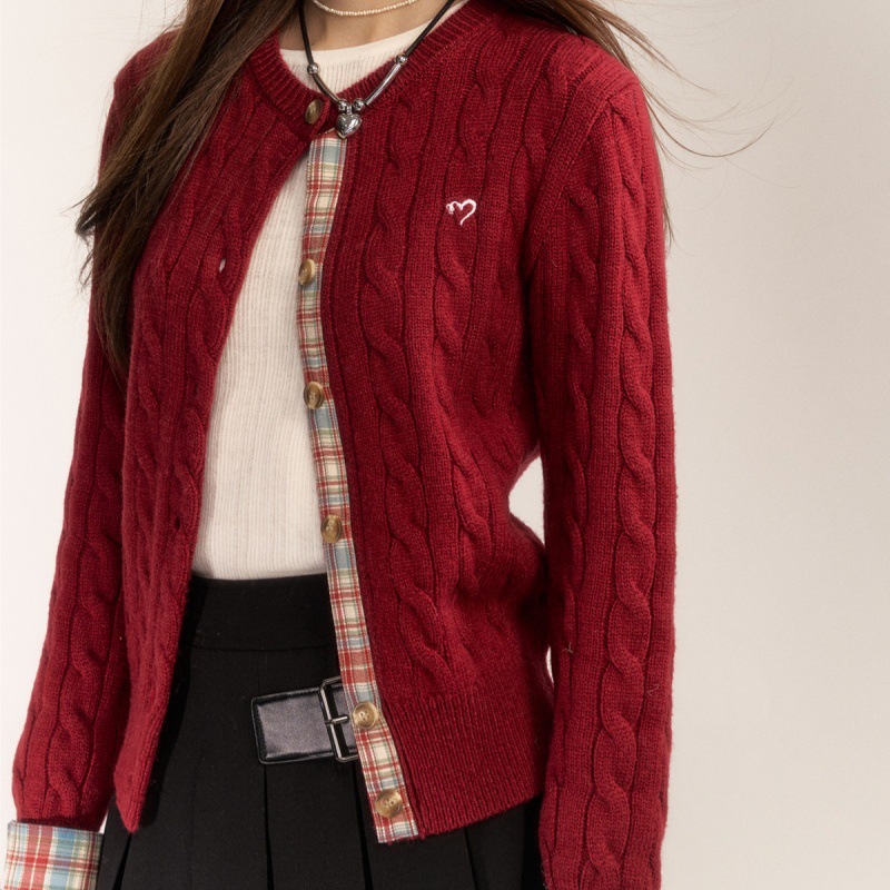 Women’s Cable Knit Cardigan | Round Neck Button-Up | Plaid Trim Detail | Slim Fit | Japanese Preppy Style