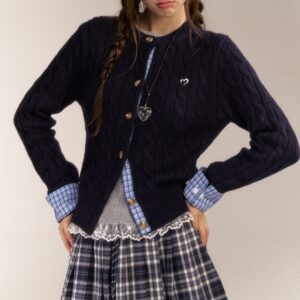 Be the first to review “Women’s Cable Knit Cardigan | Round Neck Button-Up | Plaid Trim Detail | Slim Fit | Japanese Preppy Style” Cancel reply