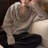 Women’s Cable Knit Sweater | Faux Fur V-Neck Collar | Relaxed Fit | Elegant Cozy Style | Fall Winter Knitwear