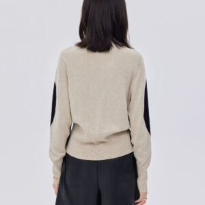 This women’s knit sweater features a clean color block design, combining a dark base with lighter contrast panels on the shoulders and sleeves for a modern and refined look.