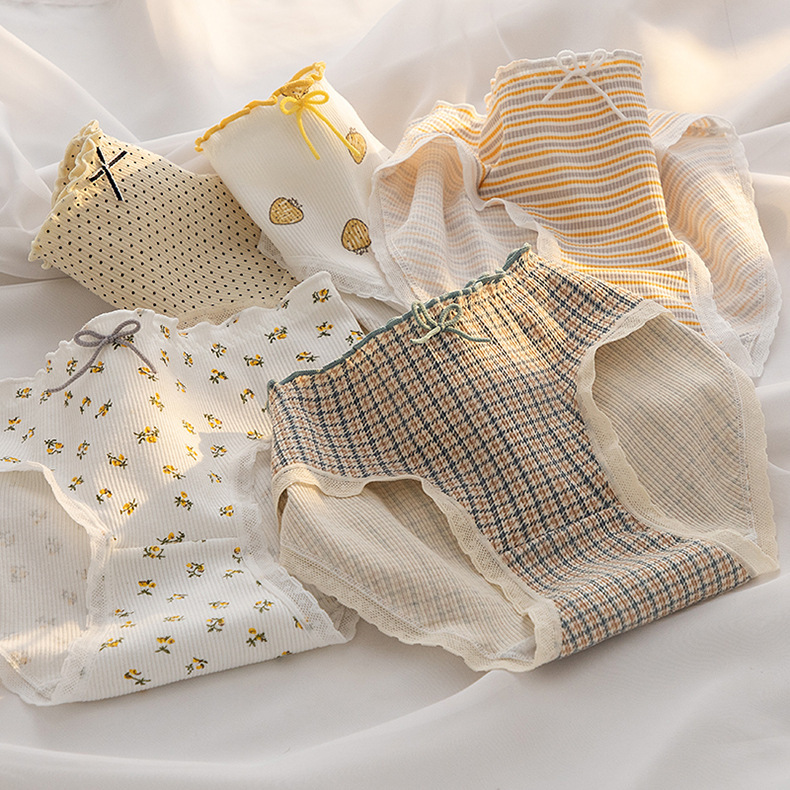 This women’s underwear set is crafted from soft, breathable cotton fabric that feels gentle against the skin. Inspired by French sweet style, each brief features delicate floral, polka dot, or plaid patterns, accented with lace trims and cute bow details for a charming and feminine look.