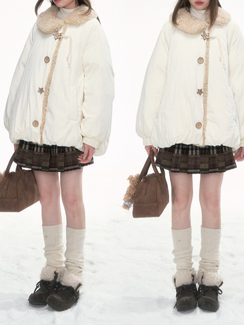 The soft faux fur turn-down collar adds extra warmth around the neck and enhances the jacket’s sweet and cozy look.
