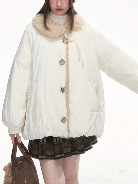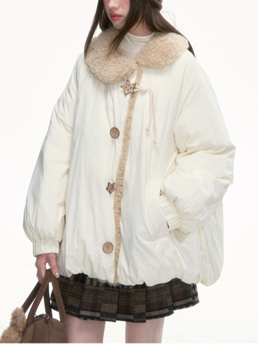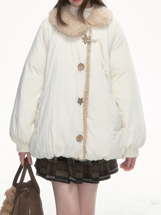 Women’s Faux Fur Collar Jacket | Short Length | Relaxed Fit | Soft Cream Color | Sweet Japanese Style